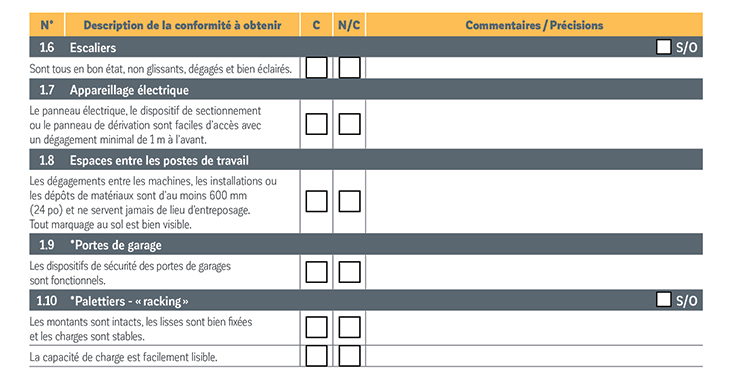 Chaque mois, une inspection complète des lieux de travail est réalisée à l’aide de la fiche d’observation mensuelle. Pour chaque élément (aménagement, équipements de l’atelier, accès à l’établissement), il suffit d’indiquer s’il est conforme ou non. Les situations non conformes ou dangereuses sont notées dans la fiche, puis des mesures correctives sont rapidement mises en place.