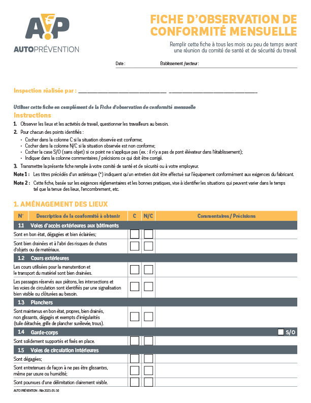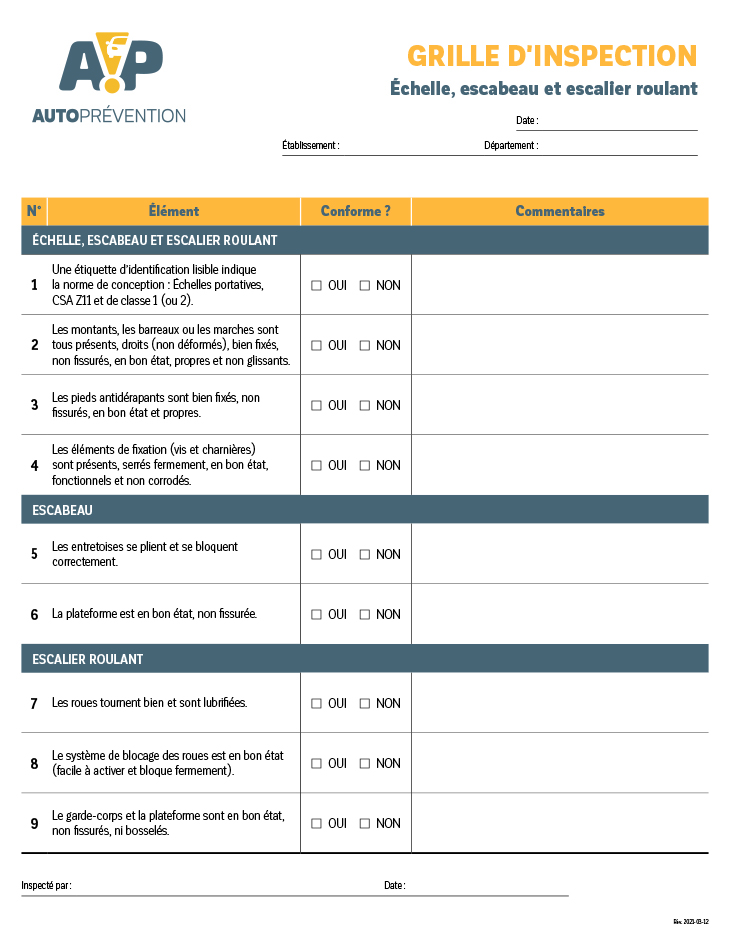 Une grille d’inspection détaillée sur les échelles, les escabeaux et les escaliers roulants est également disponible pour vous aider à effectuer une inspection plus approfondie.